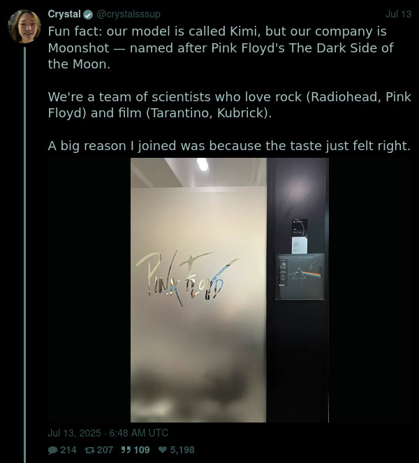 “Dato curioso: nuestra modelo se llama Kimi, pero nuestra empresa se llama Moonshot, en honor al álbum The Dark Side of the Moon de Pink Floyd.Somos un equipo de científicos amantes del rock (Radiohead, Pink Floyd) y del cine (Tarantino, Kubrick).Una de las principales razones por las que me uní al equipo fue porque me sentí identificada con sus gustos.” Crystal, parte de Moonshot.ai